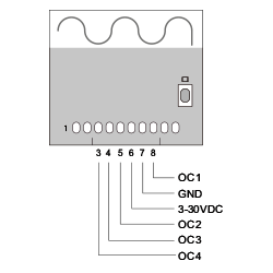 Über die Open-Collector Ausgänge werden angeschlossene Geräte entsprechend der ausgewählten Betriebsart gesteuert. Die geschalteten Ausgänge OC1, OC2, OC3 und OC4 sind den Tastencodierungen A, B, C und D fest zugeordnet.